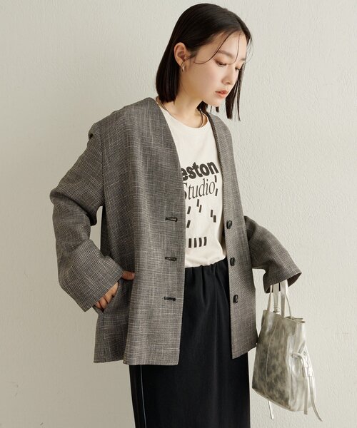 着るだけでこなれ感をプラスしてくれるノーカラージャケット・程よいゆったり感が、こなれ感を演出してくれる1枚。・通気性の良いカラミ素材を使用しており清涼感があり、春夏も涼しく着用していただけます。・首元をすっきり見せてくれるVネックデザイン。首元のアクセサリーも映えるデザイン。・カジュアルながらも、上品な雰囲気を醸し出すブラックとブラウンの2色展開。・透け感:なし・裏地:なし・伸縮性:なし・生地の厚さ:普通・光沢:なし・ポケット:あり<洗濯方法>確定次第記入いたします。--------------------------------------【商品のお気に入り登録】♡をクリックで気になるアイテムをお気に入り登録していただくと、以下の通知を受け取ることができます。・入荷・再入荷・ラスト一点・セール対象時【ブランドのお気に入り登録 】新商品や再入荷、セール、クーポン配布などお得な情報を受け取ることができます。--------------------------------------※画像の商品はサンプルです。実際の商品と仕様、加工が若干異なる場合があります。※カラーにより糸の風合いが異なるため、個体差が生じる場合がございます。※商品の色味は、撮影場所や光の当たり具合などにより色味が異なって見える場合がございます。また、お客様のお使いのPC・スマートフォン等のモニター環境などにより色味が異なって見える場合がございます。予めご了承の上ご注文ください。