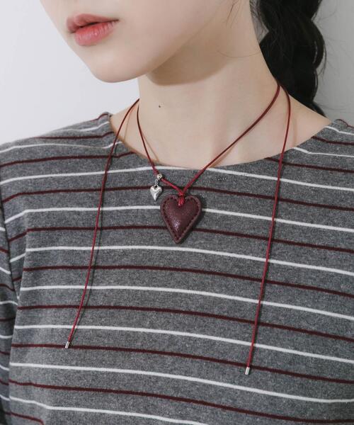 【長さアレンジ自在、ステッチハートのコードネックレス】●レザーライクなハートモチーフ●スタイリングに合わせて長さ調節ができるスライド仕様●小さなシルバーチャームがアクセントぷっくりとしたハートモチーフにステッチを施した、大人可愛いコードネックレスです。深みのあるカラーとレザー調の質感が、コーディネートに温かみをプラスします。コード部分はスライド式になっており、その日のトップスに合わせて長さを自由に調節できるのが嬉しいポイント。短くしてチョーカー風にしたり、長くしてペンダントのように着けたりと、アレンジの幅が広がるアイテムです。【2026 Spring/Summer】【26SS】※使用されている素材は特性上、摩擦や汗、雨などによる水濡れにより色落ちし、洋服や周囲のものに色移りする恐れがありますので、白や淡色の洋服と組み合わせる際などは、商品のお取り扱いに十分ご注意ください。※メッキ製品(特に銀メッキ)は変色しやすいため、こまめなお手入れで防止してください。長期放置やスプレー香料などの同時使用は、特にお避けください。※メッキ製品は、アレルギー体質の方や体調が低下している方など、かぶれることがあります。肌に異常を感じた時はご使用をお止めいただき専門医にご相談ください。※アクセサリーは壊れやすいものです。取り扱いに注意していただき大切にご使用いただけるようお願い申し上げます。総重量 : 約4.5g※商品画像は、光の当たり具合やパソコンなどの閲覧環境により、実際の色味と異なって見える場合がございます。予めご了承ください。※商品の色味の目安は、商品単体の画像をご参照ください。▼お気に入り登録のおすすめ▼お気に入り登録商品は、マイページにて現在の価格情報や在庫状況の確認が可能です。お買い物リストの管理にぜひご利用下さい。-