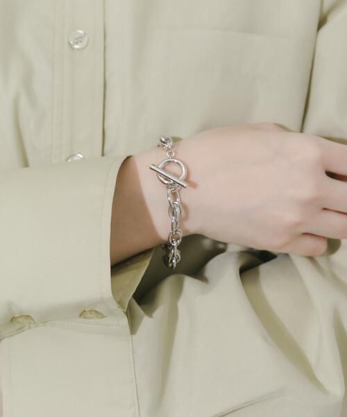 【メンズライクな手元のアクセント】●デザインのポイントになるマンテルデザイン●手首を華奢に見せる程よいボリュームチェーン●どんなコーデにも馴染む、クールなシルバーオーバル型のチェーンを繋いだ、スタンダードなブレスレット。留め具にはマンテルデザインを採用し、デザインのアクセントとしても活躍します。太すぎず細すぎない絶妙なボリューム感で、時計やバングルとの重ね付けもバランス良く決まります。シャツの袖を捲った時や、ニットの袖口からちらりと覗くシルバーが、洗練された大人のカジュアルを演出します。【2026 Spring/Summer】【26SS】※メッキ製品(特に銀メッキ)は変色しやすいため、こまめなお手入れで防止してください。長期放置やスプレー香料などの同時使用は、特にお避けください。※メッキ製品は、アレルギー体質の方や体調が低下している方など、かぶれることがあります。肌に異常を感じた時はご使用をお止めいただき専門医にご相談ください。※アクセサリーは壊れやすいものです。取り扱いに注意していただき大切にご使用いただけるようお願い申し上げます。総重量 : 約21g※商品画像は、光の当たり具合やパソコンなどの閲覧環境により、実際の色味と異なって見える場合がございます。予めご了承ください。※商品の色味の目安は、商品単体の画像をご参照ください。▼お気に入り登録のおすすめ▼お気に入り登録商品は、マイページにて現在の価格情報や在庫状況の確認が可能です。お買い物リストの管理にぜひご利用下さい。-