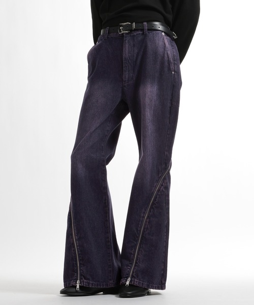 ーーー曲線のZIPデザインと、構築的なラインが特徴のワイドデニムパンツ。ーーーDESIGNフロントからバックにかけてカーブを描くように施されたZIPデザインが最大の特徴。ジップを開閉することで、シルエットに変化をつけられます。自然な立体感を生むワイドフレアシルエットで、角度によって見え方が変化するデザイン性の高い一本。モードなトップスやタイトなアウターとも相性が良く、バランスの取りやすいボリューム感です。MATERIALデニムらしい風合いを持つ綿100%素材。穿き込むほどに体に馴染み、独自の経年変化を楽しめる、育てがいのある生地です。程よい厚みとハリがあり、構築的なシルエットをしっかりとキープします。