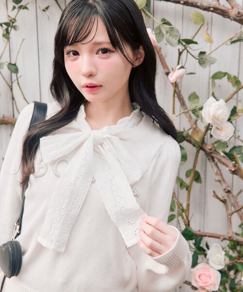大きなレースリボンが主役級にかわいいニット■デザイン・存在感のあるコットンレースリボンときらきらロゴがポイントのガーリーデザイン。・リボンは取り外し可能で、気分に合わせてシンプルでも着用していただけます。・さらっと着れるニット素材なので、インナーやアウターを変えればロングシーズン活躍します。・インしなくてもバランスがとりやすい丈感で、ボトムを選ばず着映えします。■カラー・オフ/ピンク/チャコール/ネイビーの4色展開■スタイリング・ミニスカートを合わせて韓国ガーリーなコーデがおすすめ。・デニムパンツなどカジュアルアイテムとの相性も◎・コンパクトなサイズ感なので上にアウターも羽織りやすいです。-----------------------------裏地:なし光沢感:なし透け感:なし伸縮性:あり手洗い:可能タンブラー乾燥:不可アイロン:110℃まで-----------------------------model:161cm※着用、お取り扱いの際は、商品についている品質表示とアテンションタグを必ずご確認下さい。※ご覧のモニター環境や撮影環境により実際の商品と多少色味が異なって見える場合がございます。ご理解の程よろしくお願いいたします。※引っかけ注意・粗い組織のものや、表面に凹凸があってルーズな組織のもの表面に糸が浮き出ているものは、ちょっとした不注意から引っかけてしまいがちです。取り扱いの際は取り扱い絵表示確認の上、十分注意してください。・着用時にベルトや、バックや周囲の壁など表面の粗いものとの摩擦や引っかかりに注意してください。・水洗いやクリーニングの際にも他の物ものとの引っかかりに注意して下さい。■お気に入り登録のおすすめ【気になるアイテムを登録】ハートをクリックしてお気に入りに登録すると完売カラーの再入荷やラスト1点の通知、セールの通知を受けとることができます。【ブランドを登録】新商品や再入荷、セール通知など、いち早くブランドの情報を受けとることができます。