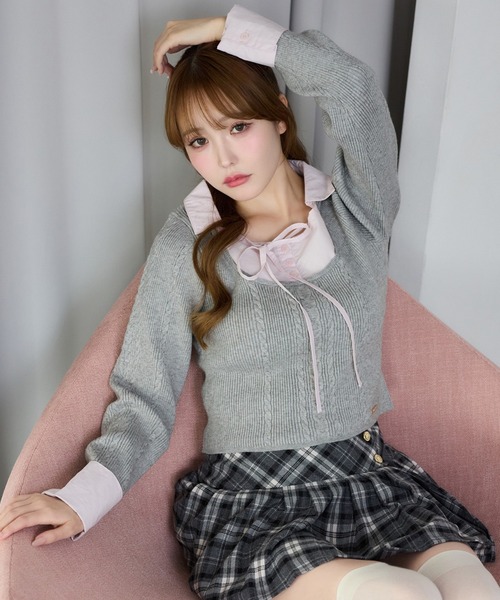 ~NICECLAUP 2026 Early Spring Collection~ニットにシャツがドッキングされた、1枚でレイヤード風に見える万能トップス。襟元のリボンが上品なアクセントになって、甘さも大人っぽさもどっちも叶うデザインです。ボトムを選ばず着回しやすい万能トップスです。■オススメスタイリングプリーツミニと合わせてガーリーにまとめるのが鉄板♡デニムと合わせて甘辛ミックスにするとこなれ感アップミニスカート+ロングブーツでスタイルアップ効果もばっちり※サンプルの為、実物はネイビーの胸部分の柄がストライプ(縦縞)になります。-------------裏地:あり伸縮性:あり生地の厚さ:普通生地の重さ:普通洗濯:手洗い/ドライ-------------【ニットアイテムのお取り扱いのご注意】※ニットアイテムは、素材特性上以下の点にご注意下さい。●この製品は素材の特性上、着用やクリーニングにより、毛羽立ちや毛玉が発生することがあります。1、1日着用した際は、2.3日休ませるなどしてご使用ください。2、毛玉が出来てしまった場合は、毛玉取り器、又はハサミで丁寧にカットして取り除いてください。●この製品はデザイン性、風合いを重視し編みたてたニット製品です。着用により若干の伸びが生じますのでご了承お願いします。又、保存時のハンガーのご使用は避け下さい※サンプルでの撮影のため、実際のものと仕様や色が異なる場合があります。※室内、室外での撮影のため実際より明るく映っていたり、暗く映っていたりする場合がございます。※品質表示を必ずご確認下さい。【商品のお気に入り登録】完売カラーの再入荷や、ラスト1点のお知らせ、セールの通知を受け取ることができます。【ブランドのお気に入り登録】新作入荷や再入荷情報など、ブランドの情報をいち早くお届けします。ぜひご登録ください♪2026SS