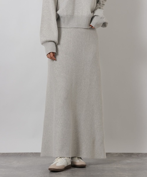 裾に向かってフレアに広がるシルエットのスカート。体のラインもひろわず、ラフな着心地なのもポイント。ウエストはゴム仕様なので着脱もしやすく、後ろにスリットも入っているので足さばきも良いアイテムです。【素材】目の詰まった編地なのでスウェットライクな見え方が特徴。伸縮性があり着やすさのある素材感です。【スタイリング】広がりのあるシルエットなのでコンパクトトップスとの相性〇同素材のトップスとのセットアップスタイルもおすすめ。