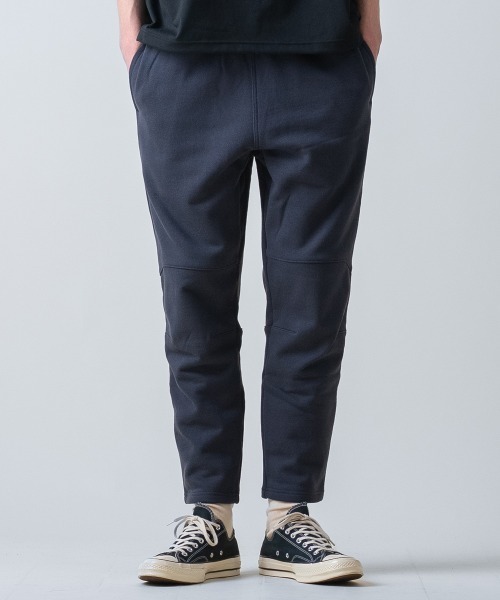 【 生地 】和歌山県で100年以上の歴史を持つニット産地・東紀繊維に製作を依頼した別注裏毛を使用。重厚なオンスと張りのある風合いが生み出す存在感に加え、度詰めで編み込むことで実現した高い密度は、着込んでも型崩れしにくいタフさを備えています。一方で、手に取ったときに感じる生地のなめらかさや、きちんと整った表情は上質さを際立たせ、日常のカジュアルから都会的なスタイルまで幅広く馴染む仕上がり。耐久性と上品さを兼ね備えた、まさに“長く付き合える裏毛”です。--------------------------------------------------裏地:なし透け感:なし生地の伸び:ストレッチ性あり光沢感:なしケア方法:洗濯機洗い可--------------------------------------------------【 デザイン・シルエット 】国内・東紀繊維の度詰めスウェットを使用し、ほどよい重みと上質なハリを持たせた一本です。モトクロスパンツのディテールをモチーフにしながら、テーパードを効かせてすっきりとした日常向けのシルエットに仕上げています。膝の切り替えが自然に立体感を生み、足のラインを綺麗に見せてくれるため、スウェットパンツでありながらラフに見えすぎないのが特徴。ウエストはイージー仕様なので、朝の散歩や休日の外出、仕事帰りのリラックスシーンまで気負わずに穿ける軽さがあります。Tシャツやスウェットと合わせればカジュアルに、シャツやアウターに合わせれば大人らしいバランスに。しっかりとした度詰め生地は季節を問わず使いやすく、通年でワードローブに入り込む実用性を持っています。
