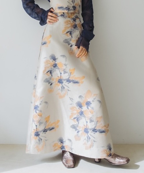 華やかな花模様と流れるようなフレアデザイン 煌めきのある花模様のジャガードが独創的な印象を醸し出すフレアスカート。 ややハリのある素材が立体的なドレープを生み出し、動きに合わせて広がる華やかなシルエットが印象的です。 存在感抜群なデザインが装いを魅力的に演出。結婚式やお呼ばれといったオケージョンシーンにはもちろん、Tシャツやスニーカーを合わせてカジュアルダウンさせたスタイリングもおすすめ。 同生地で展開している Flower Jracquard Bustier とセットアップでの着用もおすすめです。 ◼︎Point ・綺麗なAラインシルエット。 ・ややハリがあり高級感の感じる一着。 ・ウエストは後ろ部分のみゴム仕様。フロントはすっきりとした印象に。 -------------------------------- 透け感 :なし 裏地 :あり 伸縮性 :なし(ウエストあり) 光沢感 :あり ポケット:なし -------------------------------- ※画像はサンプルを使用しているため実際にお届けする商品と仕様やサイズが異なる場合がございます。 ※照明の関係により実際よりも色味が違って見える場合があります。またパソコン・スマートフォンなどの環境により、若干製品と画像のカラーが異なる場合もございます。 ※実際のお色味は商品単品画像をご確認くださいませ。 ※商品によってはシワが付きやすく、畳み皺や折り皺が強く出る場合がございます。 洗濯表示や品質をご確認の上、アイロンまたはスチームアイロンをかけていただくことを推奨します。 ブランド品番:01-SK119-25-03 【sahara/サハラ】 遠い記憶、遥か異国の土地、文化、伝統。をコンセプトとし、現代に生きる女性に、ノスタルジックなリアルクローズを提案いたします。 ●商品のお気に入り登録 再入荷、残り1点、セールなどの通知を受け取ることが出来ます。 ●ブランドのお気に入り登録 新商品や再入荷、ショップのおすすめトピックスなど、いち早くブランドのお得な情報を受け取ることができます。
