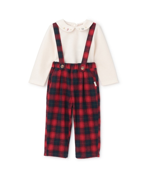 クリスマスの装いやホリデーコーデにピッタリなセットアップです。 季節感のある鮮やかなチェック柄が目を引きます。 Tシャツの衿にあしらった刺しゅうも上品なポイント。 サスペンダーはつけ外しできるため、お好みでスタイルを変えられます。 内側にお名前を記入できるタグつき。 【透け感】透けない 【生地の厚さ】普通 【伸縮性】なし 【裏地】なし 【ポケット】あり 【アジャスター】なし