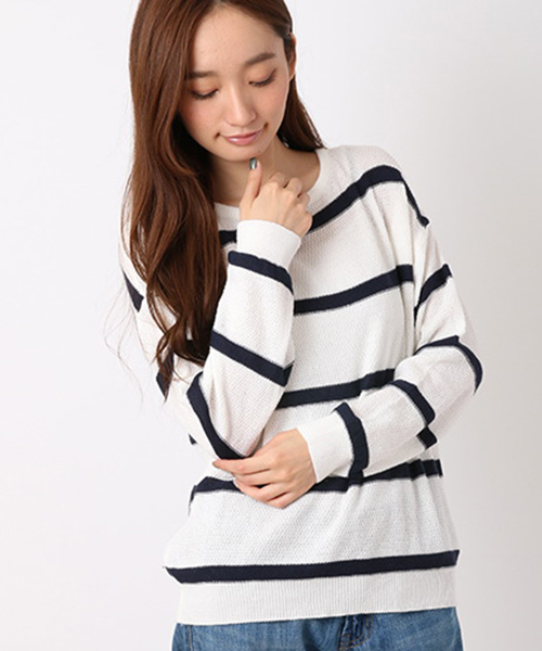 綿アクリルのボーダー鹿の子編みニットプルオーバーです。綿混紡なので肌触りも爽やかでスッキリとしています。インナーにシャツやデニムシャツ等を合わせたレイヤードスタイルがオススメ。テーパードパンツ等との組み合わせも◎