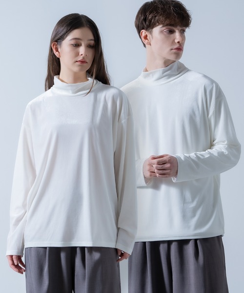 光を纏う艶めき ベロアハイネックプルオーバー●上品な光沢と滑らかな肌触りが魅力のベロア素材を使用●ハイネックデザインがスタイルアップ効果●定番のブラックに加え、ホワイト、ブラウン、チャコールなどコーディネートの主役になるカラー展開●ベロアの高級感に加え、ストレッチ素材による滑らかな着心地●セットアップ可能美しいベロア調の起毛素材はカジュアルなスタイルの中に高級感を演出します。リラックス素材だからこそ、デイリーユースに最適。セットアップでルームウェアにもおすすめ。またスラックスと合わせたレトロモダンな着こなしや、ワイドパンツで楽しむヴィンテージシックなスタイルなど様々な着回しが可能です。