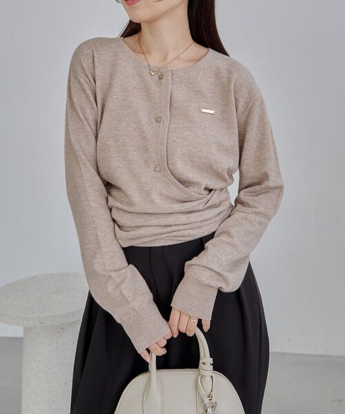 裾がアシンメトリーになった他にないデザインニット 商品ポイント ・裾のアシメデザインが着映え ・レマージュのゴールドプレートがワンポイント ・薄手のハイゲージニットで柔らかく肌あたり◎ ・アンゴラ混でふわっと起毛感のある素材 ・ボタンを開けて抜け感を出して着るのがおすすめ スタイリングポイント ・デニム合わせでカジュアルに ・トレンドのフレアパンツ合わせもおすすめ 【オフホワイト着用アイテム①】2タックワイドパンツ 【オフホワイト着用アイテム②】ミニレイヤードパンツ 【チャコールグレー着用アイテム】coming soon 【ベージュ着用アイテム】2タックワイドパンツ ********************** 透け感:オフホワイトのみややあり 裏地:なし 伸縮性:あり 光沢感:なし ********************** ▼洗濯方法 手洗い可能 ※手洗いも可能な素材ではありますが、型くずれをする可能性もございますので、 ドライクリーニングをおすすめします。 ※撮影場所やお使いのモニター環境により若干お色味が異なる場合がございます。 特にロケの撮影では明るく見える傾向にございます。 ※商品はサンプルで撮影をしております。若干の仕様が変更になる場合がございますので予めご了承の上ご注文くださいますようお願いいたします。 ▼商品のお気に入り登録 完売カラーの再入荷通知や、ラスト1点の通知、セールの通知も受け取ることができます。 ▼ブランドのお気に入り登録 新商品や再入荷など、いち早くブランドのお得な情報を受け取ることができます。