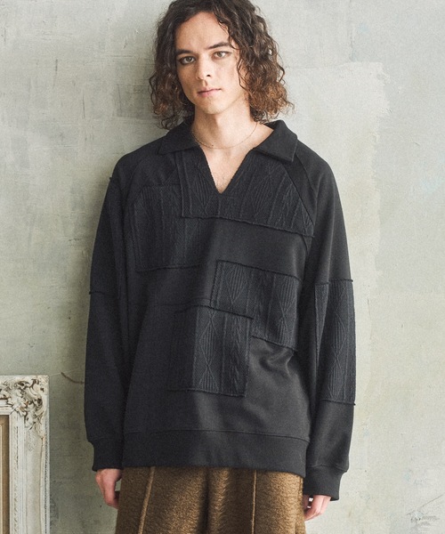 Casper John 2025 Autumn and Winter Collectioncrawl up from UNDERGROUND【Patchwork skipper sweat/パッチワークスキッパースウェット】本体には柔らかいTC裏毛を使用春まで使えるミドルウェイトです。ランダムにケーブルニットソーを貼り付けたインパクトのあるデザインネックはスキッパーにしており冬はタートル、春はタンクトップなどの薄手のインナーがおすすめデザインに合わせて着丈はやや長めに設計しており短めのブルゾンなどでレイヤードを楽しめるデザイントップスです。《BRAND CONCEPT》CREATIVE / MODE / URBAN をコンセプトに、トレンドに敏感な都会人、常に新しいファッションを求める方に、遊び心を追及した創造性の高いモードスタイルを提案する。