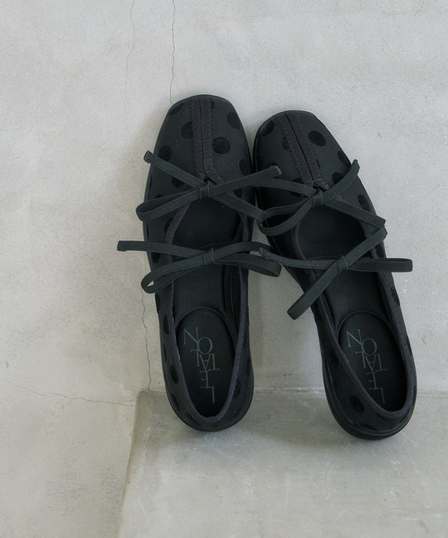発売から大人気のダブルリボンバレリーナにフロッキープリントのドット柄が登場!甲のリボンにストレッチを効かせ、ワンタッチで履けるバレリーナ。オリジナルのモールドソールを採用し、おしゃれな見た目からは想像できないほど軽量に、さらに返りの良さも実現しました。またアーチクッションのおかげで吸い付くような履き心地に仕上げ、スニーカー感覚で履いて頂ける1足に。さらに、踵の縫い割に止水テープ、ソールの接着に防水糊を使用し、完全防水ではありませんが軽い雨の日でも安心して履いていただける万能シューズです。**********************【スタッフ着用コメント】《スタッフH》普段サイズ:23.5/着用サイズ:23.5サイズ感: 素足で着用して、普段のサイズでジャスト。履き心地:いつものサイズで丁度よかったです。甲は程よい深さがあるのとストラップのおかげでフィット感抜群でした。タイツなどもこのままのサイズで履けそうでした。***********************柄の出かたには個体差がございますのでご了承ください。*防水仕様の商品ではありませんのでご了承ください。*耐滑性を保証するものではない為、滑りやすい場所での着用はお避け下さい。*デザイン上、小雨程度までのご使用をおすすめ致します。*照明の関係により、実際よりも色味が違って見える場合があります。またパソコン・スマートフォンなどの環境により、若干製品と画像のカラーが異なる場合もございます。*商品の色味は、商品アップ画像をご参照ください。