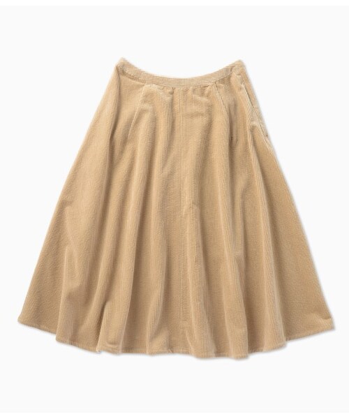 【動くたびに揺れる女性らしさを演出】柔らかなコーデュロイの素材感がウォーム感たっぷりのフレアスカート。ミディ丈に仕上げ、動くたびに揺れるフレア感が女性らしいアイテムです。オーバーサイズのニットと合わせたスタイリングがおすすめです。