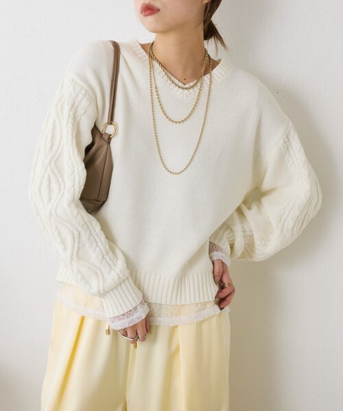 -商品ポイント- ・袖のケーブル編みデザインがアクセントになったVネックニット。 ・さらっとした肌触りでロングシーズン活躍します◎ ・顔周りをすっきり見せるVネックラインと上品な編地が大人のスタイルにマッチ。 ・大きすぎないケーブル編みで着ぶくれしないのもうれしいポイント。 ・スカートやデニム、タックパンツなどボトムスを選ばず様々な雰囲気のスタイルが完成します。 ーマテリアルー ■透け感:なし ■裏地:なし ■伸縮性:あり ■光沢感:なし ー洗濯方法ー 手洗い可能 ー注意事項ー 商品の画像はできるだけ実物に近い色味で掲載しておりますが、ご覧になるモニターや照明の環境により、実際の色味と若干異なって見える場合がございます。 あらかじめご了承くださいませ。 ・画像の商品はサンプルです。 実際の商品と仕様、加工が若干異なる場合があります。 ・サイズ表記はあくまで目安となります。 __________________________________ ※取り扱いについては、商品についている品質表示でご確認ください。 ※照明の関係により、実際よりも色味が違って見える場合があります。 またパソコン・スマートフォンなどの環境により、若干製品と画像のカラーが異なる場合もございます。予めご了承ください。 ※詳細画像の色合いをご参照ください。予めご了承ください。 __________________________________ 【お買い物をよりお楽しみいただくために♪ 】 ▼ 商品のお気に入り登録 お気に入りアイテムのお値下げ・再入荷・在庫ラスト1点など通知を受けることができます。 ▼ブランドのお気に入り登録 Jena espace merveilleuxの新商品や再入荷、セール、クーポン配布などお得な情報を受けることができます。