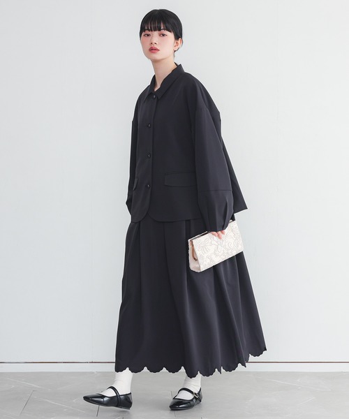 丸みのある美シルエット。品よく華やぐ大人セットアップ– Design –ふっくらとしたランタンスリーブが特徴のジャケットと、裾に華やかなスカラップ刺繍をあしらったセットアップ。ジャケットは、丸みのあるポケットや裾の角が柔らかな印象を与えます。ワンピースのシャツ襟が、ジャケットの襟元から覗くことで、顔周りをすっきりと見せるアクセントになります。ワンピースは、ウエストの高い位置で切り替え、タックを入れたフレアスカートのシルエット。動くたびにふわりと広がる優美なラインが、女性らしさを引き立てます。ジャケット・ワンピースはそれぞれ単品でも着回ししやすいのが魅力です。– Styling –セットアップで着用すれば、セレモニーやパーティーなどのフォーマルなシーンにふさわしい上品な装いが完成します。ワンピース一枚でも着用できるため、カーディガンや別のジャケットと合わせれば、オフィスやちょっとしたお出かけにも活躍。ジャケットはパンツやタイトスカートと合わせて、甘さを抑えたコーディネートも楽しめます。– Fabric –ジャケット、ワンピース共にツイル生地を使用。 どちらもさらっとした肌触りのタフタ生地の裏地付きでロングシーズン快適にご着用いただけます。– Size – 【1/2】[ジャケット]着丈:62cm/65cm肩幅:58cm/60cmアームホール:50cm/56cm袖丈:49cm/51cm袖口周り:27cm/31cmバスト:110cm/122cm裾周り:124cm/136cm[ワンピース]着丈:123cm/126cm肩幅:54cm/56cmアームホール:42cm/48cm袖丈:52cm/53cm袖口周り:20cm/24cmバスト:108cm/124cmウエスト(切替):104cm/116cmヒップ:160cm/180cm裾周り:200cm以上/200cm以上※ZOZO独自のサイズ表記とは、計測位置が異なる場合がございます。あらかじめご了承ください。.......................................................................................somari imaginationロマンティックなテイストにカジュアルのエッセンスを加えた何でもない日常をときめきで満たすための服.......................................................................................