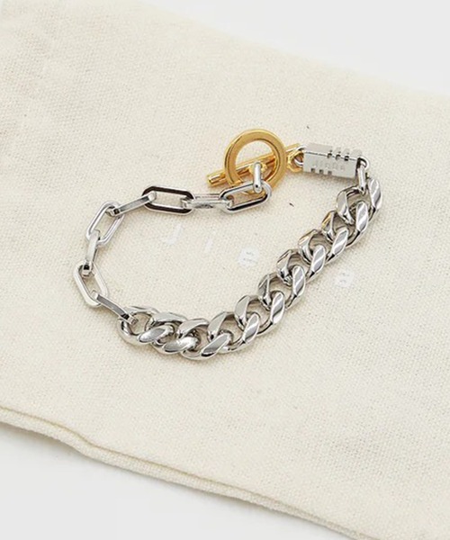 デザイン異なるチェーンをミックスさせたブレスレット。ユニセックスのフリーサイズでシーズンやテイストを問わず使用して頂けるデザイン。マンテルタイプの留め具を採用したため着脱もしやすく、ブランドロゴのネームパーツを組み込んだブレスレットとなっております。真鍮に925メッキより剥がれにくく重量感のあるロジウムメッキ加工を施しております。シルバーのブレスレットとマンテル部分のみゴールドパーツを使用した2種類ご用意しております。男女問わず着用しやすく、ギフトとしてもおすすめです。ブランドオリジナルの袋が付属いたします。SIZE OS (全長 21cm) MATERIAL: BRASSMADE IN JAPANメーカー品番:JIE-26S-GD11-JieDa-ブランド名であるJieDa=自枝(ジエダ)は自らが提案するスタイルを木になぞらえ、独自のオリジナリティが枝分かれする様に、多くの人に発信していきたいという意味合いが込められている。※店舗と在庫を共有しておりますので、受注確認メールが届いてもご注文のタイミングによりましては売り切れになる可能性がございますので、予めご了承ください。※商品の色味につきまして、撮影環境、お客様のお使いのPCのモニター環境により実際のカラーと画像の色味が違って見える場合が御座います。--------------------------------------------【お買い物をよりお楽しみいただく為に】▼商品のお気に入り登録をおすすめします。「カートに入れる」横の♡をタップまたはクリックしてください。完売カラーの再入荷や、ラスト1点の通知、セールの通知を受ける事ができます。▼ブランドのお気に入り登録も併せておすすめです。新作アイテムの入荷をお知らせします。