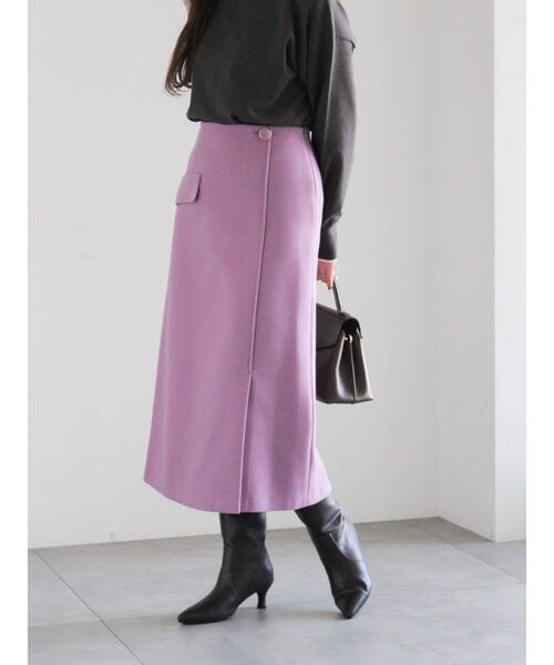しっかりとしたメルトンジャージー素材を使用したトラペーズスカート。程よくストレッチ性があり体のラインを拾わず、ラップ風なので足さばきのしやすいデザイン。程よい厚さのメルトンを使用しており、シルエットをきれいにキープしてくれます。ウエストまわりにアイキャッチのフラップをあしらっているのがポイント。ニットをインして上品に、スウェット合わせで抜け感を出しても◎ブーツやローファーとも好相性で、秋冬の着回しに重宝します。※商品画像は、撮影環境やお客様のご利用のPC・スマートフォンのモニター環境などにより実物と色味に差異がある場合がございます。【その他採寸】F ウエスト:[後ゴム仕様]63cm