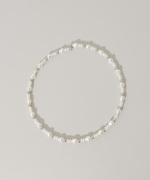 【デコルテを優しく彩る、小粒パールチョーカー】 ●繊細な小粒パールとメタルビーズのコンビネーション ●フェミニンなチョーカーデザイン ●どんなスタイルにも馴染む上品な存在感 不揃いな小粒パールとメタルビーズを交互に繋いだ、表情豊かなネックカフ。 パールの柔らかな白にメタルの輝きが加わり、甘くなりすぎず洗練された印象に。 タートルネックの上から合わせたり、シャツの襟元から覗かせたりと、アレンジも自在。 デイリーカジュアルからちょっとしたお出かけまで、幅広いシーンで活躍するアイテムです。 【2026 Spring/Summer】【26SS】 ※メッキ製品(特に銀メッキ)は変色しやすいため、こまめなお手入れで防止してください。長期放置やスプレー香料などの同時使用は、特にお避けください。 ※メッキ製品は、アレルギー体質の方や体調が低下している方など、かぶれることがあります。肌に異常を感じた時はご使用をお止めいただき専門医にご相談ください。 ※アクセサリーは壊れやすいものです。取り扱いに注意していただき大切にご使用いただけるようお願い申し上げます。 総重量 : 約8g ※商品画像は、光の当たり具合やパソコンなどの閲覧環境により、実際の色味と異なって見える場合がございます。予めご了承ください。 ※商品の色味の目安は、商品単体の画像をご参照ください。 ▼お気に入り登録のおすすめ▼ お気に入り登録商品は、マイページにて現在の価格情報や在庫状況の確認が可能です。 お買い物リストの管理にぜひご利用下さい。 -