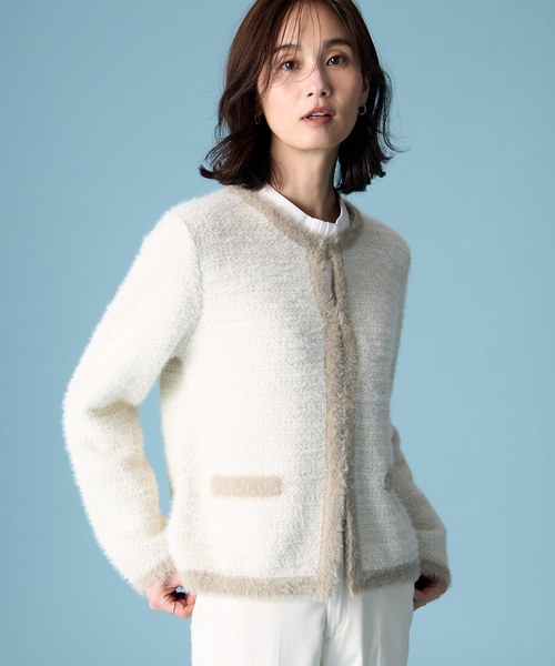 《ふんわりとしたフェザーヤーンとラメが映える上品ニットカーディガン》 カーディガンのように軽やかな着心地ながら、ジャケットのようなシルエットできちんと感をプラス。 ラメ糸がきらきらと輝くツイードニットが、シーズンムードを盛り上げます。 前立てやポケット口には配色のフェザーヤーンでふわふわとした縁取りを施しました。 シンプルなスラックスやデニムパンツと合わせて、ニットカーデを主役にしたスタイリングがおすすめ。 【デザインポイント】 ・前立てのフックで留める仕様で、ボタンがなくカジュアルすぎない印象に仕上げました。 ・きれいめなパンツやスカート、ワンピースを合わせて、食事会や家族行事にも。 ・着脱しやすく、室内の体温調整にも役立ちます。 ・すっきりとしたノーカラーデザインはハイネックインナーやブラウスをのぞかせてもお洒落です。 ----------商品情報---------- [着用目安]秋、冬、春先 [裏地]なし [透け感]なし [伸縮性]あり ---------------------------- 【サイズバリエーション】 ・Mサイズ(9号相当) ・Lサイズ(11号相当) 【着用シーン】 授業参観、二次会(2次会)、お呼ばれ、パーティー、食事会、同窓会、発表会、通勤、仕事、出張、プレゼン、在宅、デイリー、ショッピング、女子会、旅行、行楽、お出かけ、ディナー、ランチ会、記念日、デート、学校行事、オフィスカジュアル 【ブランド紹介】 《A/C DESIGN BY ALPHA CUBIC(エーシーデザインバイアルファキュービック)》は通勤時やオフィスで、学校行事や“おうちの用事”などのオケージョンで、女性が気張らずに心地良くいるための服を提案するブランドです。 【お買い物をお得にもっと楽しんで頂くために】 ▼商品のお気に入り登録▼ 完売カラーの再入荷通知や、ラスト1点の通知、プライスダウンしたセール通知も受け取ることができます。 ▼ブランドのお気に入り登録▼ 新作や再入荷等、いち早くブランドのお得な情報を受け取ることができます!