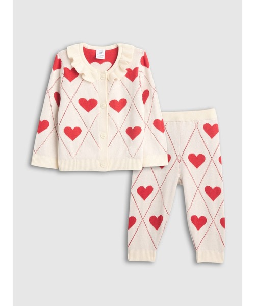 優しく心地良い肌触りのコットンニットカーディガンとプルオンニットパンツのセットラッフルフリル襟長袖フロントボタンウエストゴム仕様のパンツ裾リブ全体にハートとダイヤモンド柄*商品タグに記載の価格とサイト上の販売価格が異なる事があります。【Gap ギャップ】1969年にアメリカ・サンフランシスコで創業以来、世界的なカジュアルファッションブランドとして、常にモダンなアメリカンカジュアルを提案し続けています。※商品画像は、光の当たり具合やパソコンなどの閲覧環境により、実際の色味と異なって見える場合がございます。予めご了承ください。
