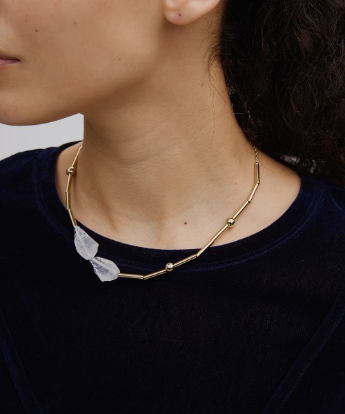 氷のオリジナルモチーフを使用したネックレス。円柱ビーズと丸ビーズを組み合わせたベースに、ジュエリーアイスという自然現象から生まれた氷のモチーフを付けたチョーカー。落ち着いた色味に仕上げるため、今回はブラックをガンメタルメッキ、ゴールドを薄炭で作成しました。✦ ジュエリーアイスとは北海道、十勝川を覆いつくす氷が太平洋に流れ出し、河口の大津海岸に打ち上げられる氷の塊が太陽の光を受け美しく輝く自然現象。※ブランドロゴのリニューアル移行期間に伴い、モデル着用商品および商品単体画像とお届け予定の商品とで付属品のロゴデザインが異なる場合がございます。予めご了承ください。※商品画像はサンプルのため、色味やサイズ、素材の混率等の仕様に変更がある場合がございますので、予めご了承ください。※モデル着用写真につきましては、光や照明の加減により、実際よりも色味が異なって見える場合がございます。商品の色味は、商品単品の画像をご参考ください。また、使用しているパソコンのモニターやスマートフォン等の設定により、現物と画像の色味が若干異なる場合もございます。予めご了承ください。《 商品に関しまして 》▼ 真鍮/アクリル製品アクセサリーをご愛用頂くにあたって、メッキ製品は体質によりかぶれを生じる場合がありますので皮膚に異常を感じた時は、ご使用をお止めいただき皮膚科専門医にご相談ください。雨、水、汗、湿気などによる色落ち、硫化による変色の可能性がありますので使用後は布等で優しく拭いて頂き、なるべく空気に触れないよう保管してください。長期放置やスプレー香料などの同時使用は特にお避け下さい。アクセサリーをつけたままの入浴や水辺での作業は厳禁です。本製品はデザイン性を重視し、繊細な仕上がりとなっております。過度な力が加わりますと破損する恐れがあります。お取り扱いには十分にご注意ください。