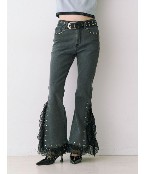 【ポイント】 フェミニンなレースとエッジィなスタッズを掛け合わせた、jouetieらしいMIXデザインのフレアデニム。 裾にレースをドッキングし、動くたびに揺れる繊細なディテールが存在感を放ちます。 サイドにはスタッズを施し、甘さの中にスパイスをプラス。 バックには「Wild You」のロゴプリントをあしらい、後ろ姿まで抜かりないデザインです。 【スタイリング】 ハイウエストのフレアシルエットが脚を長く美しく見せ、スタイルアップ効果抜群! スウェットやニット、シャツとの相性も良く、シーズンレスで活躍する主役級デニムです。 ※着用画像はフラッシュの加減で実際の製品と色味等が異なる場合がございますので、生地のズームアップ画像をご確認ください。 ※ご利用の端末画面の設定により実際の商品と色味が異なる場合がございます。 ※正しいサイズはアイテムサイズ表をご確認ください。 ※商品のお取り扱いについては、脇についている洗濯ネーム類をご確認下さい。【jouetie ZOZOTOWN お買い物ガイド】▼商品をお気に入り登録!♡をクリック!完売商品の再入荷やラスト1点の通知、セール開始時にお知らせ!▼"jouetie(ジュエティ)"をお気に入りブランドに登録!新商品や再入荷など、ブランド最新情報をいち早くお知らせ!