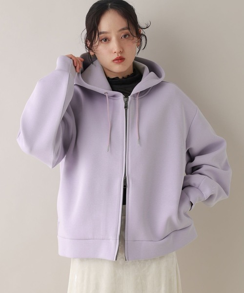 着回し力抜群な万能パーカー◎■おすすめの着こなし☆パンツスタイルには・・・スラックスなどのきれいめアイテムと合わせることで、大人見えが叶います。ラフに見えがちなパーカーですが、足元はミュールやパンプスにしていただくとクリーンな印象で着用いただけます。☆スカートスタイルには・・・フレアスカートやティアードスカートと合わせる、ほんのり甘めな着こなしが◎ジャケットなどを羽織れば、女性らしい印象で着用いただけます。■ポイントポンチ素材が心地よい、ジップパーカー。フロント部分はWジップ仕様なので、お好みのスタイルに変更可能。程よく短めの丈感なので、トップス感覚で着用できるのも嬉しいポイントです。袖部分にはさりげない刺繍デザインが施されているのも◎丸みのあるシルエットなので、女性らしい印象で着ていただけます。暖かくなってきたら羽織りとしても使用できるので、ロングシーズンお使いいただけること間違いなしです。■素材柔らかく、もちっとした肌触りが特徴的なポンチ素材を使用。着心地抜群なので、ルームウェアとしてもおすすめです。▼同素材を使用したスウェットパンツとセットアップ着用可能です。 (オフホワイト04・ブラック09のみ)・ピンタック/ポンチスウェットワイドパンツ/SET-UP対応商品コード:102221064
