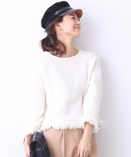 トレンドキーワードの「フリンジ」を施した旬顔のニット。デイリーに取り入れられる大人へ向けたさりげないデザインです。柔らかい素材感とゆるやかなフレアのシルエットなので、パンツとあわせたスタイルがおすすめです。