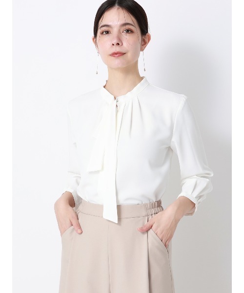 段たたみのボウタイが目を惹くクラシカルなブラウス。どんなジャケットやジレにもコーディネートしやすい、1枚あると重宝する優秀なアイテムです。 ・結ぶ手間のないボウタイで簡単に胸元を華やかな印象に。メタルパーツもアクセント♪ ・しなやかなドレープ性が上質感を生み出すジョーゼット素材。落ち感があるため胴回りを拾わずすっきりと着こなせる ・マットで表面に細かい凹凸があり、透け感が気になりにくいため、1枚でも着用しやすい ・シワになりにくく洗濯機で洗えるため、ご家庭でのお手入れもストレスフリー 【仕様】ボウタイ/7分袖 【洗濯表示】洗濯機可(ネット使用・弱水流) ーーーーーーーーーーーーーーーーーーーーーーーーーーーー 【スタッフ着用コメント】 ①女性スタッフ 身長:160cm ・着用サイズ 38 ・着用感 顔まわりを明るく見せてくれる、上品なラベンダーブラウス🤍 ボウタイを結ばなくても、形が出来ているので楽々です◎ 一枚でもきれいに着られて、オンオフ問わず活躍します。 ーーーーーーーーーーーーーーーーーーーーーーーーーーーー 【おすすめシーン】 食事会、お呼ばれ、デート、パーティー、女子会 オフィスカジュアル、ビジネス、仕事、通勤 結婚式、披露宴、セレモニー、2次会、1.5次会 成人式、同窓会、謝恩会 七五三、お宮参り、誕生日会、入学式(入園式)、卒業式(卒園式) 演奏会、発表会、参観日などの学校行事 ※同サイズまたは同一商品でも、生産の過程で1.0cm~2.0cm程度の個体差や着用感の違いが生じる場合がございます。 ※カラー名は管理用の表記となります。実際の商品の色味は商品画像をご確認ください。 ※商品画像はできる限り実際の色に近づけて掲載しておりますが、パソコン環境により色味に誤差が生じる場合がございます。予めご了承下さいませ。