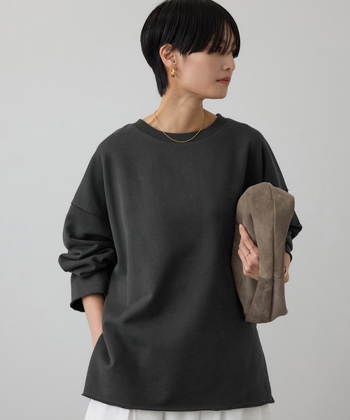 クリーンに着られる大人のローエッジスウェット。抜け感のあるシルエットと上品な素材で、カジュアル過ぎず洗練されたスタイルを楽しめる万能トップス■デザイン/シルエットシルエットにこだわって仕上げた大人のローエッジスウェット。ミニマルでクリーンなデザインはロンT感覚で気軽に着られ、抜け感のあるクルーネックが顔周りをすっきり見せてくれます。ドロップショルダーとゆったりしたサイズ感が程よいリラックス感を演出。後ろ丈を長めに設定してヒップをカバーし、サイドスリットで抜け感と動きやすさも両立。フロントインしやすい設計で、どんなボトムともバランス良く決まります。■素材上品な表面感をもつ大人向けスウェット素材を使用。厚すぎず軽やかで、ロングシーズン快適に着られるのが魅力です。適度なハリがあり、体のラインを拾いにくいのも嬉しいポイント。吸湿性・吸水性に優れ、スウェットならではの伸縮性も備えたストレスフリーな着心地。カラーは柔らかなオフ、ニュアンスのあるモカ、シックなチャコールの3色展開です。■コーディネートレースやサテンの華やかなボトムと合わせたMIXスタイルが新鮮。マニッシュなスラックスとも好相性で、レザーバッグや上品なシューズを合わせると大人の抜け感コーデが完成。同素材のセミフレアスウェットパンツとのセットアップスタイルもおすすめ。一般的なスウェットよりカジュアルになりすぎず、幅広いシーンで活躍します。■同素材のアイテムとセットアップでも着用いただけます。商品番号:SHS26050 商品名:【WEB限定】スウェットフレアパンツ商品番号:SHM26010 商品名:【WEB限定】ローエッジオーバースウェットプルオーバー■モデル身長:165cm 着用サイズ:F-----------------------------光沢感:なし透け感:なしポケット:なし伸縮性:あり生地の厚さ:ふつう-----------------------------