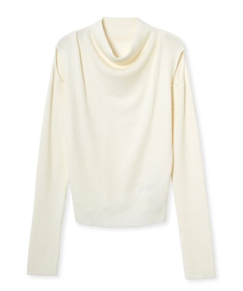 【スタンドカラーにドレープ感を加えた人気のコールドショルダースリーブリブニットプルオーバー】【Design/Styling】カシミヤ5%、シルク3%入りで肌触りの良い薄手のリブニットでお作りした、袖付けに空きのあるドレープ入りプルオーバーがお目見え。細やかなリブの薄手のニット生地で、ストレッチ性があり着心地も抜群。レイヤードにも使いやすいアイテムです。袖付けにカットデザインで程よい肌見せを加えて、シンプルながらも個性的の光るデザインに仕上げました。首元はスタンドカラーにトレンド感のあるドレープを加えて、今季らしいニュアンスを出しました。チュールスカートに合わせたり、スウェットパンツに合わせたり、着回し力も抜群です。【Fabric】使い勝手の良いアイボリー、ブラック、ホリデー気分を盛り上げる鮮やかなレッドの3色展開です。透け感;なし裏地;なし伸縮性;あり光沢感;なし生地の厚さ;やや薄手【おすすめ骨格タイプ】■骨格ウェーブ※照明の関係により、実際よりも色味が違って見える場合があります。またパソコン・スマートフォンなどの環境により、若干製品と画像のカラーが異なる場合もございます。予めご了承ください。商品の色味は、商品単品画像をご参照下さい。 ※商品画像はサンプルのため、色味やサイズ等の仕様に変更がある場合がございますので、予めご了承ください。