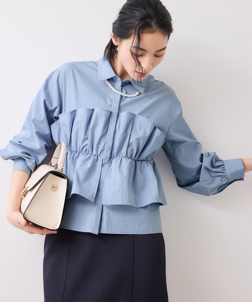 1枚でレイヤード風の着こなしが叶うビスチェドッキングシャツ【2026 Spring】【26SS】 人気だったシャツが春カラーで新登場! <POINT> ・お手入れの簡単なマシンウォッシャブル ・旬なビスチェレイヤードスタイルが1枚で叶うシャツ ・表面感のあるシャツ素材でキレイ目にもカジュアルにも着回せます。 ・フロントにポイントがあるのでアウターインにぴったりです! 【デザイン・シルエット】 ベーシックなシャツシルエットに立体的なビスチェをレイヤードしているようなデザインです。 身頃の切り替えにパーツを挟み込みドッキングして、ビスチェ部分の生地端を身頃に数か所点止めをしているので崩れることなく、立体的な形状をキープできます。また、切替部分はゴム仕様で程よくシェイプ。ビスチェ下部分をインして着用することも可能です。 【素材】 張り感がありつつ、表面感のあるシャツ地。 洗濯機洗い可能。 ※カラーにより、組成・混率が異なります。 オフホワイト(15):ポリエステル 100% ブルー(44)、ピンク(63):綿 66% ナイロン 34% 【カラー】 オフホワイト(ストライプ)、ブルー、ピンクの3色。 【おすすめのスタイリング】 キレイ目パンツでハンサムに着こなすのがおすすめ! ビスチェ部分の下はインすることができるのでマーメイドスカートとも相性◎。フロントにポイントがあり、フリル見えするので女性らしさもプラス。美easyシリーズとのスタイリングがおすすめ!ぜひジャケットインに合わせてほしいアイテムです。 ----------------------------- 裏地:なし 光沢感:なし 透け感:ややあり 伸縮性:なし ポケット:なし ボタン:あり(開閉可) 生地の厚さ:やや薄手 その他仕様:胸元の下にゴムあり、ビスチェは取り外し不可 季節:春、秋 ----------------------------- 【モデル着用サイズ】 身長:168cm 着用サイズ:F ※画像の商品はサンプルです。 実際の商品と仕様、加工、サイズが若干異なる場合がございます。 ※画像によっては実際の色味と異なる場合があります。正しい色味は生地アップ画像をご確認ください。