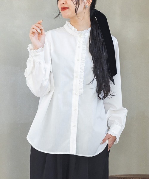 甘すぎない華やぎを、さりげなく。 襟元から前立てと、袖口にたっぷりとフリルをあしらったギャザーフリルブラウス。 アウターやカーディガンを羽織る際にももたつきにくいセットインスリーブで、レイヤードもすっきり楽しめます。 柔らかい肌触りで着心地の良い布帛生地を使用。 薄すぎない程よい厚みで、季節の変わり目から快適にご着用いただけます。 襟と前立て端にギャザーフリルを施し、上からジャケットを羽織った際にも、 この華やかなフリルがしっかりと際立ちます。 特別な日からデイリーまで、 オケージョンスタイルにはもちろん、合わせるアイテム次第でカジュアルにも着回せる優秀アイテム。 【size 1/2】 着丈:67cm/70cm 肩幅:38cm/42cm アームホール:46cm/50cm 袖丈:59cm/60cm 袖口周り:20cm/24cm バスト:107cm/119cm 裾周り:120cm/132cm ....................................................................................... n'OrLABEL ほかにない、私のデイリーウェア 毎日の生活を心地よく自分らしく過ごすための服。 遊び心を取り入れた、大人のカジュアルスタイル。 .......................................................................................