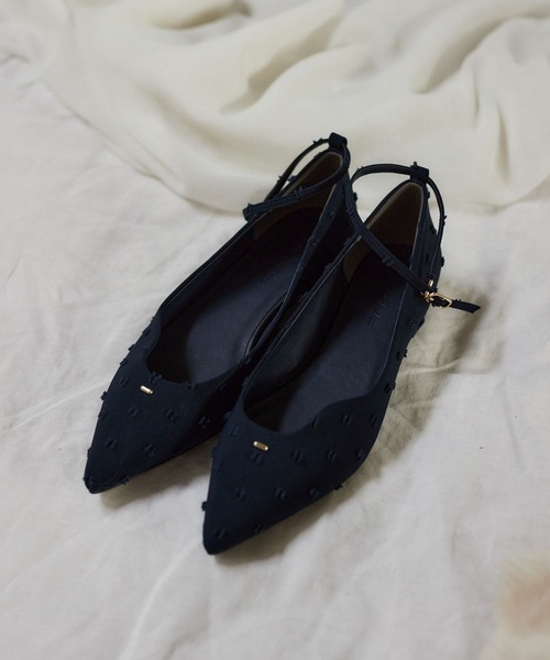 ーーー甲のラインを曲線カットに仕上げ、華奢見えにこだわったパンプス■point・肌の抜け感で足元が軽やかにすっきりとした印象に・シャープなポインテッドトゥが洗練された大人スタイルを叶えます・フェイクレザーのブラックと、表面感のあるドット生地を使用したネイビーのアソート展開・ちょこんと小さいゴールドアクセントがワンポイントに・足元が安定するアンクルベルトと歩き疲れにくいローヒールでデイリーに使いやすいですーーー■styling足首が見えるスカートやワンピースの時はソックス合わせもおすすめです。ロング丈ボトムスと合わせたときの肌見えバランスも良いので、デイリーに活躍します。きれいめに合わせられる上品なアイテムなので、オケージョンやセレモニーシーンにもぴったりです。※屋外の光や照明の当たり具合で、実際の商品の色味とカラー別画像の色味に若干の違いが発生する場合がござい 詳細画像と併せてご確認の上、ご注文いただきますようお願い致します。【INFORMATION】■商品のお気に入り登録完売していても再入荷時に再入荷通知を受け取ることができますので、是非ご登録ください!■ブランドのお気に入り登録新商品や再入荷などの情報を受け取ることができますので、是非ご登録ください!