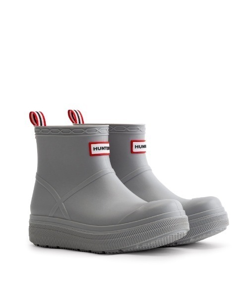 HUNTER/人気のPLAYBOOTをアップデート!手に取りやすく履きやすい、誰にでも履いてほしい注目の新作レインブーツライトグレーカラーハンターのベストセラー「プレイブーツ」が新しく生まれ変わりプレイモールデットブーツとしてデビュー。人気のプレイブーツのディテールはそのままに、素材をPVC変更、一つの型から作るシームレスな仕上がりにアップデート。ソールには「PLAY」のエンボス加工をさりげなく施しました。足首の上まで覆うショート丈、フラットなプラットフォームソールは、脱ぎ履きもし易く快適な履き心地です。防水仕様なので雨の日はもちろんのこと、フェスなどのアウトドアシーンにも大活躍のレインブーツです。丸みを持たせたアッパーのフォルムとほどよい厚みのソールの組合せが愛嬌を感じさせる、カジュアルなスタイリングにマッチするシルエット。ユニセックス仕様なので幅広いサイズから自分にぴったりの大きさを選べるところも魅力。雨の日でもハッピーな気分でお出かけしたくなる、初めてHUNTERのレインブーツを履く方にもおすすめしたいブーツです。・防水ブーツ・雨の日のレインブーツとして・ガーデニング、お庭仕事に・フェス、キャンプ等のアウトドアシーンにサイズ(UK5):筒丈(cm)12.5/ヒール高さ(cm)4.5/片足重さ(g)465