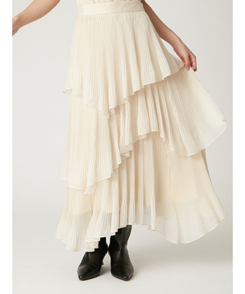 【贅沢な揺れ感を堪能できるティアードプリーツスカート】 【Design/Styling】 光沢感のある軽やかなシフォンオーガンジーにプリーツ加工を施したティアードスカート。 ティアードはアシンメトリーに入れることでフェミニンすぎずどこかモードに。 また、表情豊かな揺れ感を演出するために3段それぞれの裾部分のプリーツは消して、ヘムラインが広がるように設計しました。 バックウエストにはゴムを施し履き心地も快適に。 リブニットを合わせたきれいなスタイリングから、シャツでヘルシーにカジュアルダウンしていただくコーディネートまで、幅広いアイテムと好相性に着ていただけます。 サイドファスナーで着脱も簡単。 クリーンなWHT、フェミニンなCRM、大人っぽいNVYの3色からお選びいただけます。 ※照明の関係により、実際よりも色味が違って見える場合があります。 またパソコン・スマートフォンなどの環境により、若干製品と画像のカラーが異なる場合もございます。予めご了承ください。 商品の色味は、商品単品画像をご参照下さい。 ※商品画像はサンプルのため、色味やサイズ等の仕様に変更がある場合がございますので、予めご了承ください。
