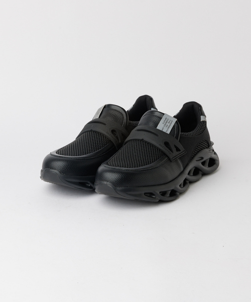 デザインと機能を融合した注目の一足 【デザイン】ローファーのフォーマルなフェイスとスニーカーの軽快さが融合したハイブリッドな一足。アッパーにはメッシュ素材やナイロン、合皮等をコンビさせたミクスチャー感が特徴。素材を幾重にも重ねることで、トレンドの強い現代の服装にも違和感なくマッチします。ボリュームあるデザインですが、片足約300gと軽くて履きやすいのもポイント。 【素材】 ナイロン、立体感のあるメッシュ、イージーケアな合成皮革、メタリック感のある反射素材を使用。 ・デザイナーコメント メンズシューズのトレンドのローファースニーカーを制作。 都市のドレスコードを再編集し、実験的なマテリアルとエンジニアリングで、クラシックとテックを循環させる。 その世界観を前面に出し、BLACK を軸としたカラー展開を提案。 反射・透過・金属光沢の異素材ミクスチャーで現代の足元に違和感なく溶け込むが、近づくと” 工業的違和感” が立ち上がる。 レースアップスニーカー品番:52522106001 サイズ感について ・一般的なスニーカーと比較してもおおよそ0.5cm~1cm程大きく作られております。Ex.普段27.0cmを履かれている方は、SIZE:42(26.0cm)程度とお考え下さい。 ※履き方・足型等、個人差はございますので、あくまでも参考程度にお考え下さいませ。
