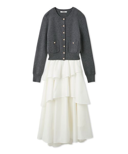 【サステナ素材を使用! 上品ニットカーディガンとふんわりティアードスカートのセット】【Design/Styling】クルーネックデザインのクラシカルなニットカーディガンと、布帛生地でふんわりと立体感を出したティアードスカートの異素材MIXが華やかな人気のセットアイテムが届きました。程よくコンパクトなニットカーディガンで、ボリュームのあるボトムスとも相性抜群。フロントの艶やかなゴールドボタンがアクセントに。左右にもゴールドボタン付きのパッチポケットを配置し、ほんのりカジュアル感をプラスしました。セットのスカートは、柔らかな生地を使用し、動くたびに軽やかにふんわりと揺れるティアードデザインが視線を集めるデザインです。サイドのファスナーで着脱いただけます。ウエスト位置背中側にはゴムを入れ、フィット感を出して着心地良く仕上げました。スカートは裏地付きです。【Fabric】イエロー(ニットがバター風味のまろやかなイエロー、スカートがホワイト)、グレー(ニットがグレー、スカートはホワイト)、ボーダー(ブラックとアイボリーのボーダーピッチ、スカートはホワイト)の3色展開です。ニットのみサステナ素材を使用しています。【Recycled Polyester】使用後のポリエステル商品を粉砕し、糸や生地にアップサイクルさせた「POST CONSUMER」、工場での製造過程で発生する端切れや糸くずなどを使用する「PRE CONSUMER」をSNIDELでは使用しています。透け感;なし裏地;あり伸縮性;あり光沢感;なし生地の厚さ;普通【おすすめ骨格タイプ】■骨格ストレート■骨格ウェーブ■骨格ナチュラル※照明の関係により、実際よりも色味が違って見える場合があります。またパソコン・スマートフォンなどの環境により、若干製品と画像のカラーが異なる場合もございます。予めご了承ください。商品の色味は、商品単品画像をご参照下さい。 ※商品画像はサンプルのため、色味やサイズ等の仕様に変更がある場合がございますので、予め