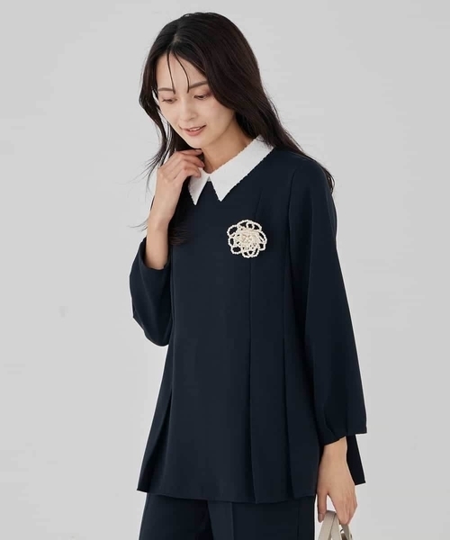 ◆通勤にもOK、入学式・卒業式・七五三・セレモニー◆ 【デザイン】 ・襟付きデザインが上品なブラウス ・襟は表面感のある素材で華やかな印象 ・襟が取り外し可能の2WAY仕様 ・付け襟を外すとシンプルなクルーネックに ・ゆるやかなペプラムシルエットで体のラインがきれいに見える ・ジャケットレスでもきれいにまとまる一枚 ・セレモニーからオフィス、デイリースタイルまで幅広いシーンで活躍 ・甘すぎない大人も着やすいデザイン 【素材】 ・上品なとろみ素材 ・ご家庭の洗濯機で洗えて、アイロンいらずのイージーケア ・毛玉になりにくく、速乾性のある素材を使用 【コーディネート】 同素材ボトムとのセットアップ着用はもちろん きれいめデイリースタイルまで幅広く着こなせる一枚。 ジャケットインもしやすく日常の通勤スタイルから 卒園、卒業や入園、入学などのセレモニーシーン、 七五三や学校行事、発表会などお子様のハレの日にも◎ フォーマルな場やビジネスシーンに活躍します。 -------------------- 着用シーズン 春:◎ 夏:× 秋:◎ 冬:○ --------------------
