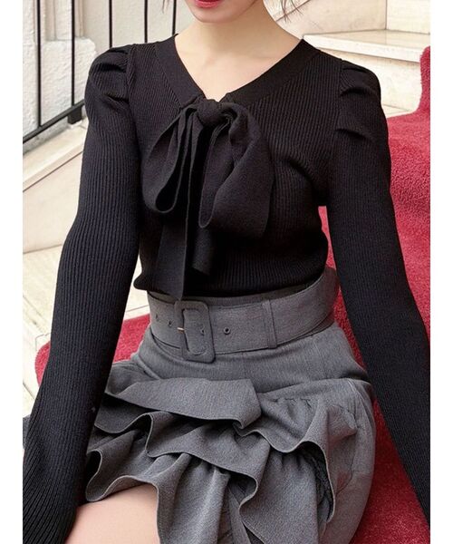 リボンがワンポイントのベーシックニット▽デザイン▽デコルテのリボンデザインがコーデに映える1枚。タイトなサイズ感で細見え◎パワショルデザインが女性らしい可愛らしさもプラスします。ベーシックなデザインで1枚持っていると重宝するニットです♪▽カラー▽白・黒・ラベンダーの3色展開。▽スタイリング▽ハイウエストボトムにインしたスタイリングがおすすめ!スカートでもデニムでもどんな雰囲気のボトムスにも合わせられ、ジャケットを羽織ってもリボンデザインがアクセントになります◎