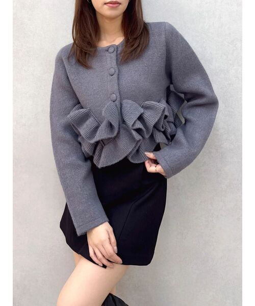 【商品】裾にあしらった構築的なフリルデザインが目を惹く着映えニットジャケット。コンパクトなシルエットで女性らしさを引き立てつつ、ニットならではの柔らかな着心地も魅力。羽織るだけでコーデ全体に華やかさがプラスされ、デイリーからデートまで幅広く活躍する一枚です。 【スタイリング】今季はヘムフリルが引き立つミニボトムス合わせがおすすめ。足元はロングブーツやソックス&パンプスで知的さをプラスすると、トレンド感アップ。 デニムやスラックスパンツで、カジュアルダウンさせてもカワイイです。 ※実際にお届けする商品と仕様やサイズが異なる場合がございます。また生産の都合上、お届け時期が前後する場合がございます。【 お買いものにおすすめの便利機能! 】★商品のお気に入り登録完売カラーの再入荷時や、ラスト1点の時、セール開始時にお知らせします。★ブランドのお気に入り登録新商品や再入荷、セール情報など、いち早くブランドのお得な情報を受け取ることができます。ぜひご活用ください。