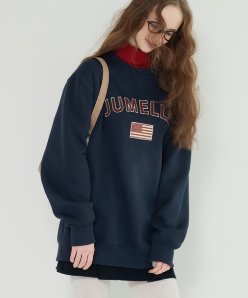 胸元にワッペンをあしらったようなデザインが、カジュアルな印象のオーバースウェット。[JUMELLE]の文字にはコーデュロイ素材、星条旗はデニム素材を使用した、遊び心のあるデザイン。真冬にも温かい裏起毛素材を使用した、暖かく、素肌にも心地よい着心地です。しっかり長さのあるデザインで、女性はミニワンピ風に着用も可能。男性も着られるユニセックスデザインなので、ペアルックや彼と共有で使うのもおすすめ〇両サイドにはポケットをあしらった、利便性にもこだわったアイテムです。