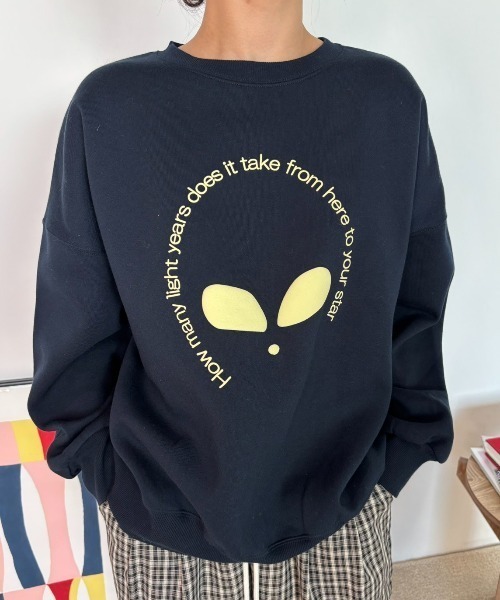 立体的なエイリアンが目を引くポップなプリントスウェット■デザイン/素材スタイリングに遊び心を加えてくれるプリントスウェット。「How many light years does it take from here to your star」(=ここからあなたの星まで何光年ありますか)立体感のある発泡プリントは宇宙人のSFな雰囲気にぴったり。■スタイリング程よく厚みがあり柔らかい裏起毛生地は保温性抜群で使い勝手の良いアイテム。暖かいので冬のインナーにはもちろん、春先の1枚着としても大活躍。たっぷりと身幅を取ったルーズシルエットなのでボトムスを選ばないのも嬉しいポイント。……………………透け感 : なし厚さ:やや厚め伸縮性:ややありお手入れ方法:手洗い推奨……………………※ご注意※・屋外の光や照明の当たり具合で、実際の商品の色味とカラー別画像の色味に若干の違いが発生する場合がございます。・詳細画像と併せてご確認の上、ご注文いただきますようお願い致します。【MERLOT】肩の力が抜けた都会的なライフスタイルをテーマにレディースからユニセックスまでジャンルレスに展開。ファッションとカルチャーを織り交ぜた、それぞれの生活に馴染むルーズなスタイルを提案します。【商品のお気に入り登録】完売カラーの再入荷通知やラスト1点の通知、プライスダウンの通知を受け取ることが出来ます。【ブランドのお気に入り登録】新商品や再入荷など、嬉しい情報を受け取る事が出来ます。ぜひご登録ください◎ストリート/シティ/シティボーイ/シティガール/メンズライク/テック/ノームコア/古着ライク/ カジュアル / トレンド / 秋服/冬服/春服/ユニセックス