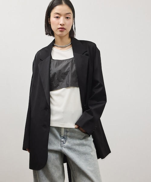 ◇26SS◇ ADAM ET ROPE' FEMME 【Material】 綺麗な表面感でシルクの様な上品な微光沢感が魅力的な素材。 【Design】 上品な素材感とリラックスしたシルエットにより、洗練された雰囲気の漂うシングルブレストのテーラードジャケット。 オーバーサイズながら、肩まわりのパターンにこだわり、肩に馴染む様に仕上げたデザイン。 大きめのラペルと深めのVゾーンでスッキリとした印象で着用が可能。 【Color】 ブラックとベージュの2色展開。 【Styling Point】 オールインワンやワイドデニム、スラックス合わせがおすすめ。 --------------- 透け感:なし 裏地:あり 伸縮性:なし 光沢感:微光沢 生地の厚さ:やや厚手 開き方:ボタン開き ポケット:あり --------------- ◇モデル情報 身長:166cm size:38 ※撮影時の光、お使いのモニター環境によって色の見え方が違う場合がございます。