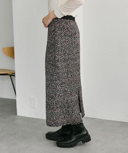 伸縮性抜群で動きやすさ◎くしゅくしゅ素材感が可愛いタイトスカート■デザイン・着心地・凹凸感のあるくしゅくしゅとした素材感が華やか・シンプルトップスに合わせるだけでもお洒落に決まる・さり気ない小花柄がポイント・伸縮性に優れているのでタイトシルエットながら動きやすい・軽やかな着心地・シワを気にせず過ごせるデザイン・ウエスト総ゴムで着脱もしやすい・バックスリット入り■サイズ追記・着丈:81cm(ベルト巾込み)・ベルト巾:4cm・スリット:40cm・裏地丈:50.5cm《スタッフ着用コメント》(身長160㎝/普段着用サイズ:Mサイズ/骨格ウェーブ)くるぶしから手のひら一つ分ほど上の丈感。伸縮性のある素材なのでタイトシルエットでも走れるくらい動きやすいです。ウエストが総ゴムなので着脱しやすいのもポイント。■スタイリング身体にフィットするようなシンプルな無地ニットに合わせてすっきりとまとめるのも良いですしゆったりとしたスウェットやニットトップスなどと合わせてカジュアルに着るのもおすすめ。■素材・お手入れ方法・素材表地:ポリエステル86%・アクリル14%裏地:アクリル98%・ポリエステル2%・洗濯表示ドライクリーニングオンリー・・・・・・・・・・・・・・・・・・・・・・透け感:なし裏地:あり伸縮性:あり光沢感:なし生地の厚さ:普通・・・・・・・・・・・・・・・・・・・・・・【SUM1 STYLE(スミ スタイル)】とは…ear PAPILLONNERのアパレル、グッズを展開するインブランド。 コンセプト▼メンズライクの中より溢れ出る女性らしさ動きのある大人の新しいニューカジュアル自らファッションを創り出す人々に提案SUM:統合 1枚で決まる洗練されたスタイルSUM:総和 生地と生地、柄と柄、無限の組み合わせの答えSUM:和 人と人、洋服 SUM:要点 デザインを明確に伝えるインパクト