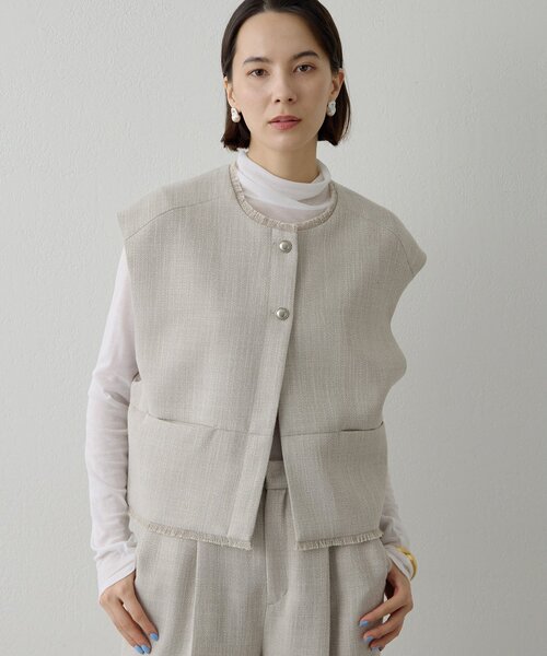 【2026SS】 普段使いからセレモニーまで活躍するツイードジレ ■細かく織られたツイード素材を使用したショートジレ。 ■程よくゆったりとした丸みのあるシルエットが柔らかい印象に見せ、ツイードの上品さもプラスされ女性らしさが光る一枚。 ■肩先が隠れるフレンチスリーブで、スリーブレストップスとしても着やすいデザイン。 ■すっきりとしたショート丈で、ハイウエストのボトムスとスタイルアップ効果も。 ■衿ぐりと裾に施したフリンジやシルバー釦がアクセントになり、普段使いにもセレモニーにもおすすめのアイテム。 ■同素材の【THE PAUSE】ツイードタックパンツ(ブランド品番:WGP1052502A0001)とのセットアップもおすすめ。 【COLOR】 ライトグレー:ややグレイッシュなニュアンス感のあるライトベージュ。 ブラック:シックな印象を与えてくれる上品なブラック。 【STAFF COMMENT】 ■身長155cm|普段サイズ S~M|着用サイズ F 普段使いしやすいツイードジレ。柔らかい素材で楽な着心地です。ボタンが上側だけなのでインナーが見えて抜け感が出ます。セットアップで着るとオケージョンにも使えます。 ■身長162cm|普段サイズ S~M|着用サイズ F 身幅も大きく軽いツイードジレです。優しい印象のカラーが素敵。ショート丈なので座った時もシワにならず安心。デニムやスカートを合わせれば式典だけでなく、日常スタイルにも良い◎。 ---------------------------------------------------- 洗濯方法:ドライクリーニング 透け感:なし 裏地:あり 伸縮性:なし 光沢感:なし ---------------------------------------------------- ― THE PAUSE(ザ ポーズ) ― 流行を自分らしい発想で切り取ってコーディネートを遊ぶ。 色のグラデーション、ヴィンテージ感漂うワークアイテム・・・ ギャラリーのようなクローゼットの中から 組み合わせをデザインするようにファッションを楽しむ。 そんな、自由なライフスタイルをもつ大人の女性にむけて 新しい感覚のカジュアルスタイルを提案します。 【注意事項】 ・画像の商品はサンプルです。実際の商品と仕様、加工が若干異なる場合があります。 また 、パソコンやスマートフォンのモニター環境などにより、色味が違って見える場合があります。 ・店頭及び屋外での撮影画像は、光の当たり具合で色味が違って見える場合があります。 商品の色味は、スタジオ撮影の画像をご参照ください。 ・入荷状況により、お届け予定が前後する場合があります。 ・お客様への発送が店頭販売より遅れる場合があります。 ・追加生産商品は、一部の店舗、通販で販売中の場合があります。 予めご了承下さい。 【気になるアイテムは、「お気に入り」登録を】 ハートマークをクリックしておくことで、スムーズにお買い物が楽しめます。 ・ラスト一点のお知らせ ・再入荷のお知らせ ・SALEのご案内