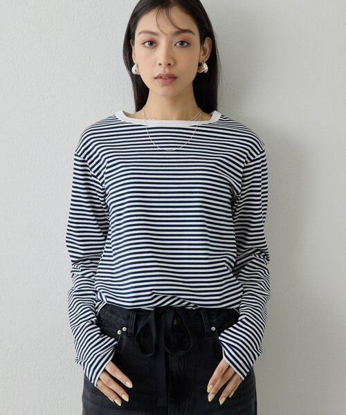 【2026SS】大人の着こなしに馴染む、細めボーダーロンTEE■細ピッチボーダーのロングスリーブカットソー。■一枚でもインナーにも着まわしやすいコンパクトなサイズ感に仕上げた一着。■細めのボーダー柄がカジュアルになりすぎず、大人の着こなしに馴染むのが◎。■すっきりとしたクルーネックが今っぽく、襟ぐりの配色も程よいアクセントに。■ストレッチ性のある素材で着心地も良く、デイリーな大人のカジュアルスタイルにぴったりのアイテム。【COLOR】ネイビー:クリーンなムードを演出する、ホワイト×ネイビー。ブラック:白黒よりもカジュアルすぎない、ベージュ×ブラック。【STAFF COMMENT】■身長160cm|普段サイズ M~L|着用サイズ F手首にたまる長めの袖は普通のロンTEEよりもこなれて見えるのもポイントです。クセのないシンプルなデザインは、流行りに左右されず定番アイテムとして取り入れやすいのが◎。ジャケットなどのインナーとしても、オンオフ兼用で活躍できるアイテムです!■身長165cm|普段サイズ S~M|着用サイズ Fメインにもインナーにも使える程良い大きさです。透け感あるトップスのインナーに入れるとアクセントになります。----------------------------------------------------洗濯方法:手洗い可透け感:なし裏地:なし伸縮性:あり光沢感:なし----------------------------------------------------― THE PAUSE(ザ ポーズ) ―流行を自分らしい発想で切り取ってコーディネートを遊ぶ。色のグラデーション、ヴィンテージ感漂うワークアイテム・・・ ギャラリーのようなクローゼットの中から 組み合わせをデザインするようにファッションを楽しむ。そんな、自由なライフスタイルをもつ大人の女性にむけて 新しい感覚のカジュアルスタイルを提案します。【注意事項】・画像の商品はサンプルです。実際の商品と仕様、加工が若干異なる場合があります。また 、パソコンやスマートフォンのモニター環境などにより、色味が違って見える場合があります。・店頭及び屋外での撮影画像は、光の当たり具合で色味が違って見える場合があります。商品の色味は、スタジオ撮影の画像をご参照ください。・入荷状況により、お届け予定が前後する場合があります。・お客様への発送が店頭販売より遅れる場合があります。・追加生産商品は、一部の店舗、通販で販売中の場合があります。予めご了承下さい。【気になるアイテムは、「お気に入り」登録を】ハートマークをクリックしておくことで、スムーズにお買い物が楽しめます。・ラスト一点のお知らせ・再入荷のお知らせ・SALEのご案内