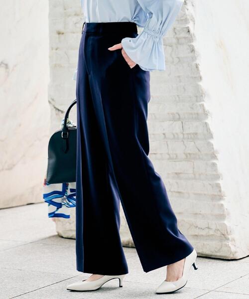 【デザイン】 スタイリングの幅が広がる定番ワイドパンツ。 すとんときれいに落ち感が出るので、太すぎずきれいに見せてくれるシルエットが昨年も好評でした。 スーツ・セットアップとしても着用いただけます。 ウエストからヒップに掛けてすっきりとしたシルエットにしています。 後ろウエストにゴムが入っており、穿き心地の良い仕様にしています。 軽く、ストレッチ性もあるのできちんと見えを叶えながらも、動きやすいパンツです。 【素材感】 天然パルプを原料とするエコ原料のトリアセテート高混率のダブルクロス。 細番のトリアセテートと極細ポリエステルの仮撚加工糸を撚糸したハイグレードの糸を使用した二重織素材になります。 シルキードライなタッチとドレープ性、ストレッチ性が特徴で、豊かな膨らみ感と弾力性が美シルエットを演出させる素材です。 細番ゆえに非常に軽く仕上げた素材となります。 ■ネイビー(694) ネイビー(094)に比べ若干の青みがございます。 【着こなしポイント】 同素材のテーラードジャケット(商品番号:153-45103)やジレ(商品番号:153-45105)、とのセットアップでの着用がおすすめです。 また、同シリーズでノーカラージャケット(商品番号:153-45104)やワンピース(商品番号:153-55103)、フレアスカート(商品番号:153-75103)、テーパードパンツ(商品番号:153-65103)の展開があります。 少し着丈が長めなファンシーツイードジャケット(商品番号:153-45106)との合わせですと、より華やかな印象になりセレモニーや特別な日におすすめなスタイルです。 【仕様】 ・ポケット数:横×2 ・裏地あり ※照明の関係により、実際よりも色味が違って見える場合があります。また、パソコン・スマートフォンなどの環境により、若干製品と画像のカラーが異なる場合もございます。 店舗へのお問い合わせ商品番号:153-65104 ●製品寸法: 00(XS):W65cm H90cm 股下64cm 渡り幅30cm 裾幅24cm 01(S):W68cm H93cm 股下70cm 渡り幅31cm 裾幅25cm 02(M):W72cm H97cm 股下70cm 渡り幅32cm 裾幅26cm 03(L):W75cm H100cm 股下71cm 渡り幅33cm 裾幅27cm 04(2LT):W78cm H103cm 股下71cm 渡り幅34cm 裾幅28cm 42(2L):W82cm H107cm 股下70cm 渡り幅36cm 裾幅29cm 44(3L):W86cm H111cm 股下70cm 渡り幅37cm 裾幅30cm 46(4L):W90cm H115cm 股下70cm 渡り幅38cm 裾幅30cm 48(5L):W94cm H119cm 股下70cm 渡り幅39cm 裾幅31cm 50(6L):W98cm H123cm 股下70cm 渡り幅41cm 裾幅31cm 備考: