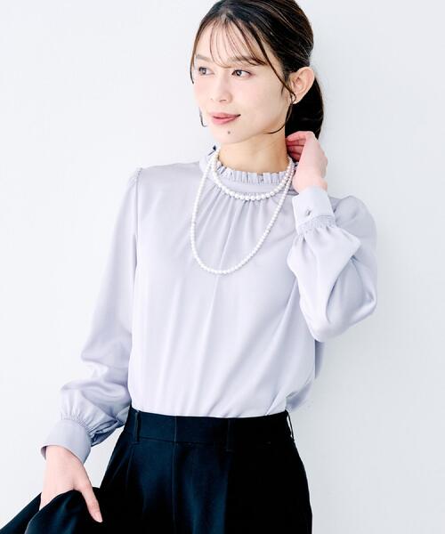 【デザイン】 昨年も人気のハイネックフリルブラウスがリニューアルして登場です。 上品な光沢と落ち感のある素材のブラウスには、ハイネックにフリルディテールとギャザーを施しました。 今年は、袖口にシャーリングディテールを加えワンポイントに。 フリルのディティールが顔周りを華やかにしてくれるインナーブラウスです。 【素材感】 ポリエステル100%のサテン素材。 華美になりすぎない上品な光沢感と表面のシボ感が特徴です。 非常に落ち感がありシルエットを綺麗に見せてくれる品のあるサテン素材になります。 【着こなしポイント】 ジャケットのインナーとしてももちろん、1枚でも光沢があり上品な華やかさを演出してくれます。 ※照明の関係により、実際よりも色味が違って見える場合があります。また、パソコン・スマートフォンなどの環境により、若干製品と画像のカラーが異なる場合もございます。 モデル情報:身長163cm B80 W59 H82 着用サイズ:02(M) 店舗へのお問い合わせ商品番号:153-85104 ●製品寸法: 00(XS):着丈54cm B96cm 袖丈55cm 肩幅35cm 01(S):着丈57cm B99cm 袖丈57cm 肩幅36cm 02(M):着丈58cm B103cm 袖丈57cm 肩幅37cm 03(L):着丈59cm B106cm 袖丈58cm 肩幅38cm 04(2LT):着丈60cm B109cm 袖丈59cm 肩幅39cm 44(3L):着丈60cm B118cm 袖丈57cm 肩幅40cm 46(4L):着丈61cm B122cm 袖丈58cm 肩幅41cm 48(5L):着丈62cm B126cm 袖丈58cm 肩幅41cm 50(6L):着丈63cm B130cm 袖丈59cm 肩幅42cm 備考: