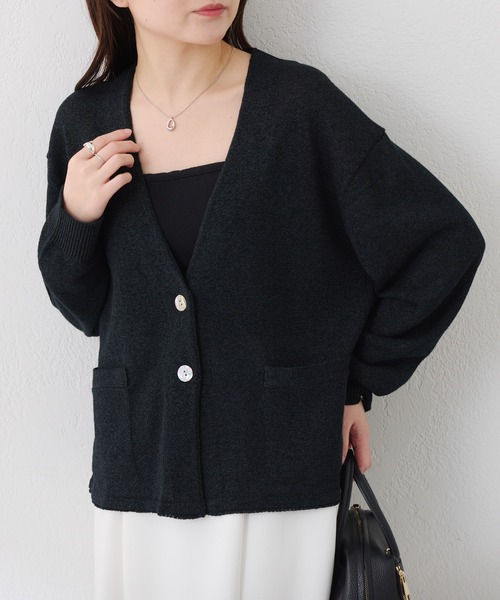こだわりのディテールが着心地の良さを叶えるカーディガンWEB限定カラー:ブラック【POINT】・さらっとしたリネンライクな素材のカーディガン。・本物の阿古屋貝のボタンが高見えとおしゃれ感をアップしてくれます。・裾はリブ編みをせず、襟部分には総針をすることでノーカラージャケットっぽいきちんと見えも叶います。・ポケットはリンキング留めをすることで前を開けて着た際に生地が踊らないように仕上げました。【おすすめコーディネート】まだ寒い時期はジャケットと重ねても、羽織り、冷房対策としてもロングシーズン活躍します。長すぎない丈でワイドパンツやフレアスカート、ワンピースともバランス良く決まります。【おすすめのスタイリングアイテム】・2WAYサテンキャミソール CLZ1061204A0009・Q.anos チャーム付きタックワイドパンツ CLQ5061103A0001・ラメリブスクエアロンT CLZ1052406A0003・ジャージワイドパンツ CLZ1061202A0002・タフタタックパンツ CLZ1061202A0003【素材】レーヨン39%、分類外繊維(紙)34%、再生繊維(セルロース)14%、綿13%透け感:ややあり裏地:なし伸縮性:あり光沢感:なしおすすめ着用時期:春、夏、秋洗濯:手洗い可≪返品・交換について≫・着用後、洗濯後の返品・交換は致しかねます。・商品到着後、着用前に商品状態のご確認をお願い致します。・ECサイトでご購入いただいた商品は、お修理を承っておりません。【気になる商品は「お気に入り」登録を】ハートマークをクリックし、お好きなカラーを選んでお気に入りに登録すると入荷情報や残り1点の通知、完売カラーの再入荷、セール情報などを受け取ることができます。※撮影場所やお使いのモニター環境により若干お色味が異なる場合がございます。特にロケの撮影では明るく見える傾向にございます。詳細撮影画像で色味をお確かめくださいます様お願いいたします。※サンプルで撮影をしております。若干の仕様が変更になる場合がございますので予めご了承の上ご注文くださいますようお願いいたします。※サンプルでの採寸のためあくまで目安となります。予めご了承ください。