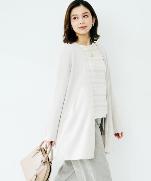 【デザイン】 程よい肉感とハリ感がある綺麗目なミラノリブのシリーズ。綺麗目な定番的な軽羽織のカーディガン。 寒くなったらコートインにも着ていただける程よい肉感、素材感です。 サイドポケット付きです。 【素材感】 防縮加工を施した21~21.5マイクロンのウールと、抗ピル性が高いアクリル短繊維混紡の、 毛羽が少なく艶感や程良いハリ感がある、綺麗目な表面感が特徴の細番手の毛混素材。(24AW継続素材) 【着こなしポイント】 ブラウスとパンツスタイルや、ワンピースに軽く羽織ったり、Tシャツとデニムに合わせてカジュアルにも。 合わせる小物にきちんと感を少し加えると品よくまとまります。 【仕様】 ・ポケット数:横×2 ・裏地なし ※照明の関係により、実際よりも色味が違って見える場合があります。また、パソコン・スマートフォンなどの環境により、若干製品と画像のカラーが異なる場合もございます。 モデル情報:身長161cm B79 W58 H86 着用サイズ:02(M) 店舗へのお問い合わせ商品番号:153-34556 ●製品寸法: 00(XS):着丈74cm B96cm 袖丈52cm 肩幅40cm 02(M):着丈78cm B106cm 袖丈53cm 肩幅44cm 04(2LT):着丈82cm B112cm 袖丈54cm 肩幅47cm 44(3L):着丈81cm B120cm 袖丈53cm 肩幅49cm 48(5L):着丈81cm B128cm 袖丈52cm 肩幅53cm 備考: